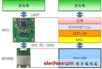 满足ECHONET Lite的协议栈构成例如图4所示,是通过BP3596与微控制器板连接到整机中的。只要具备这样的协议栈,即可将HOST侧本体的变更控制在最小,从而安装920MHz频段特定小功率无线。当然,也可以采用直接存储于HOST的形式。