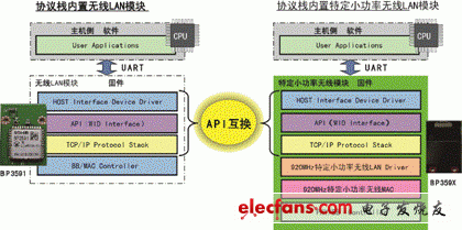 罗姆充分利用已经量产的无线LAN模块(BP3591等)的技术积累,正在推进内置无线LAN和API互换协议栈的特定小功率无线模块的开发(图6)。以往进行过无线LAN开发的客户,使用该资源即可大大加快开发速度。