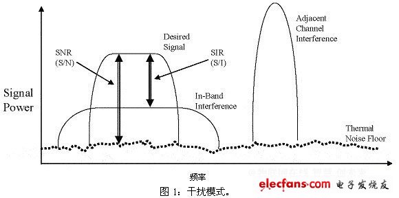 干扰还可能来源于相邻的信道。在这种情况下,802.11系统的RF子系统与数字过滤的设计还可以对AP或基站的性能造成极大影响。此外,WLAN网络的物理设计可以消除带内干扰的很多反射。通常由信号干扰比率(S/I或SIR)决定WLAN的性能,该比率的定义是数据信号与干扰信号的比率。对于WLAN的性能而言,SIR通常比信噪比(SNR)更加重要。下面的图1解释了这一概念。