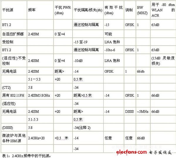 表1中的大多数干扰源均为窄带设备,如:无绳电话或蓝牙产品等。在很多情况下,该类产品可以在一米之内或WLAN客户端设备中进行操作。即使有传播损失,这些干扰源仍然可以为位于802.11接收机链路一端的LNA提供高达0dBm。