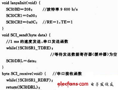 MCA8HCS12G128单片机的软件设计需要实现对程序的初始化、接收与发送串口信号、速度和位置数据的采集等功能。为了保证上位机采集数据的可靠性和稳定性,防止出现丢包事件,在通信过程中约定了双方的握手方法。在程序初始化以后,等待fwrite命令发送的握手信号0xFF.当单片机第一次接收到的信号为0xFF时,则握手成功,并开始运行电机和激光头等子程序。在实验过程中发现存在发送的第一组数据第一个字节丢失的现象,为了增强数据的可靠性,首先判断数据包的前两个字节是否为0xFF,是则剔除相应字节,分离出有效的数据,再在回送的速度、激光传感器的数据中嵌入两个字节的握手信号0xFF,Matlab接收到串口的数据后进行相应的处理。智能车控制器通信的总程序流程如图3所示。