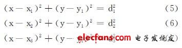 设位置节点D(x,y),已知A、B、C三点的坐标为(x1,y1),(x2,y2),(x3,y3)。它们到D的距离分别是d1、d2、d3.则D的位置可以通过下列方程中的任意两个进行求解。