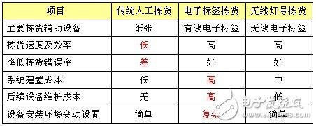 无线灯号拣货系统目前已在***某汽车大厂率先导入;由于汽车业是接单生产,在同一条生产线上前后生产的品项都不一样,因此在零件拣货的速度与正确性要求特别严谨,平均3分钟就要完成一次拣货流程。汽车厂之前使用有线式的电子标签拣货系统会有偶发性线路故障无法排除需要请专人来维修,导致系统往往要停摆一段时间才能够恢复正常,造成拣货作业的困难。导入无线灯号拣货系统后,无线传输本身没有线路故障的问题;灯号标签若发生故障,拣货人员自行就可以更换硬件,配合后端系统修改RFID零件对应,在几分钟内就可以排除故障继续使用。