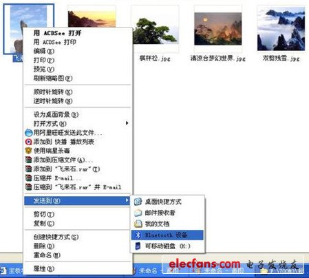 5、完成蓝牙适配器和手机的配对后,就可以从电脑和手机上传送资料了。从电脑上发图片或数据到手机或其他蓝牙设备,选中您要发的文件点鼠标右键选发送到蓝牙设备。