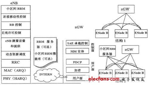 3GPP初步确定LTE的架构如图1所示,也叫演进型UTRAN结构(E-UTRAN) [3]。接入网主要由演进型NodeB(eNB)和接入网关(aGW)两部分构成。aGW是一个边界节点,若将其视为核心网的一部分,则接入网主要由 eNB一层构成。eNB不仅具有原来NodeB的功能外,还能完成原来RNC的大部分功能,包括物理层、MAC层、RRC、调度、接入控制、承载控制、接入移动性管理和Inter-cellRRM等。Node B和Node B之间将采用网格(Mesh)方式直接互连,这也是对原有UTRAN结构的重大修改。