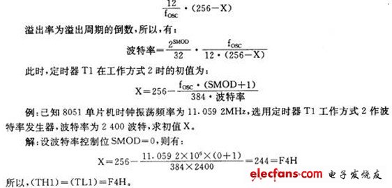当定时器Tl作波特率发生器使用时,通常选用可自动装入初值模式(工作方式2),在工作方式2中,TLl作为计数用,而自动装入的初值放在THl中,设计数初值为x,则每过“256一x”个机器周期,定时器T1就会产生一次溢出。为了避免因溢出而引起中断,此时应禁止T1中断。这时,溢出周期为:
