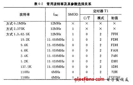 如果串行通信选用很低的波特率,可将定时器Tl置于工作方式0或工作方式1,但在这种情况下,T1溢出时,需用中断服务程序重装初值。中断响应时间和执行指令时间会使波特率产生一定的误差,可用改变初值的办法加以调整。上表列出了各种常用的波特率及其初值。