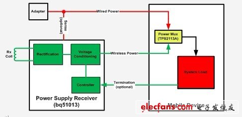 图 2 还显示了通过有线适配器和无线充电实现充电的过程。两种电源都连接至移动设备内部的功率多路复用器。一般而言,默认情况下选择适配器电源,在没有适配器时使用无线充电。