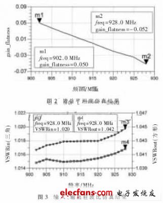 图2中的m1表示在902 MHz~928 MHz频段内,放大器最大增益偏离平均值0.05 dB,m2表示最小增益偏离平均值为-0.052 dB;图3中的m3和m4分别表示在整个频段内放大器的输入驻波比最大为1.02,放大器的输出驻波比最大为1.047。