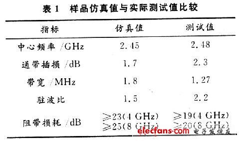 从表1可以看出,仿真值与实际值接近,但是存在一定的差异。导致器件性能变差的因素很多,如流延出来的介质基片厚度不一致。印刷叠层和热压造成的错位,切片时的偏差和器件变形及共烧时的收缩不均匀等。解决这些问题除了提高工艺水平外,前期的优良设计也是解决的途径之一。如在设计中尽量避免耦合间距过小,层数过多等,同时应多采用简洁的电路结构,减少不必要的工艺过程。