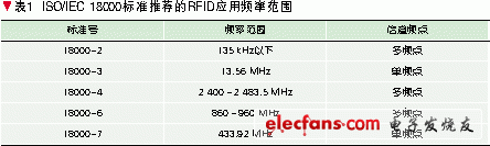 表1为国际标准ISO/IEC 18000标准系列中推荐RFID设备使用的频率范围。