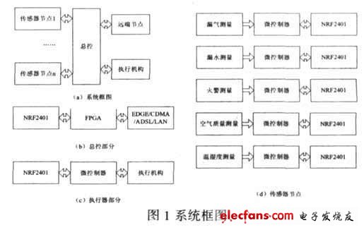 如下图1(a)图所示,传感器节点采集信号通过空中无线接口传输到总控,总控将信息传输到远端节点,并分析处理。图1(d)中各传感器节点采集传感器信息,为了减少功耗,节省体积,采用的传感器均为集成式传感器, 一个传感器可以采集多个同类信号, 传感器采集信息后, 低功耗微控制器将采集信号通过NRF2401 向总控部分传输。图1(b)中总控部分激活传感器节点采集信号,并集中分析处理,将融合信息通过无线或有线方式传到远端节点,将远端节点或总控部分分析的处理意见,控制图1(c)中执行机构进行相关的处理。执行机构根据收到相关控制指令,控制相关设备进行处理。