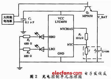 充电控制单元连接着太阳能电池板和锂电池,其功能主要是有效地将收集到的能量存储在锂电池中。本设计中太阳能电池板选用80mm× 45mm的电池板,此电池板最大输出功率时输出电压为5.5 V,电流为150 mA,转换效率为16%。锂电池没有记忆效应,选用一款容量为2 000 mAh,工作电压为3.7 V的锂电池。该单元控制部分采用凌力尔特公司(Linear Technology Corporation)推出面向锂离子电池的智能充电控制芯片LTC4070。该器件以其450 nA的工作电流,用以前不能使用的非常低电流、断续或连续充电,对电池进行充电和保护。该器件的功能非常适用于连续和断续、低功率充电电源应用。LTC4070具有引脚可选的4.0V,4.1 V或4.2V设置,其1%准确度的电池浮置电压允许用户优化电池容量和寿命之间的平衡。独立的低电池电量和高电池电量监察状态输出表明电池已放电或充分充电。加上一个与负载串联的外部PFET,该低电池电量状态输出实现了锁断功能,该功能自动使系统负载与电池断接,以保护电池免于深度放电。充电控制单元原理图如图2所示。