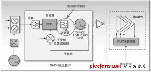 图1给出了当前大多数GSM手机中使用的平移(或偏移)环(translational loop)架构。这种架构的主要优点是利用锁相环(PLL)结构中的低通滤波器以起到带通滤波的功能,从而不需要任何额外的滤波器就能提供优良的频谱屏蔽性能,而且对调制器模块没有严格的要求。该解决方案经过几代产品的改进,其性能、集成度和成本等各方面都已经得到了高度优化。