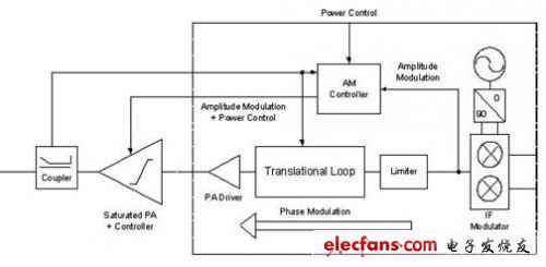 “极性”调制器的概念是为了保留平移环结构,因此保留上述全部优点。然而为了支持EDGE模式,还必需对调制器增加调幅(AM)能力:在调制器输出端去掉AM调制,馈送到幅度控制器,再馈送到高动态范围的VGA,从而再生成射频AM和PM复合信号。将该信号馈送到一个纯粹作为放大器的线性PA单元。由于PA没有得到补偿,所以它的线性度和动态范围必须非常高才能保证信号质量。当然,线性PA通常不如饱和PA的效率高。