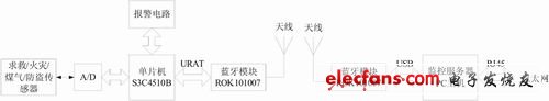 结构框图中前半部分为一个基于蓝牙模块的终端探测单元电路,主要由传感器、数模转换模块、S3C4510B单片机、报警电路及ROK101 008蓝牙模块组成;后半部分为中心控制单元电路,主要由PC机和蓝牙模块组成。