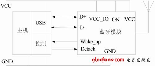在中心监控单元,PC机和蓝牙模块的通信通过USB接口来实现。使用USB接口方式通信时,是将蓝牙模块当作一个USB从设备与主机通信的,通过双向端口D+和D-传输数据。对于PC机应有唤醒和分离两个边带信号来控制PC机的状态,当主机处于低功耗模式,如果蓝牙模块接收到建立连接的请求时,Wake_up引脚输出高电平,唤醒主机。主机的挂起状态可通过Detach信号来实现,当Detach输出高电平时,芯片脱离USB状态。主机与蓝牙模块的接口电路。