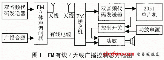 遥控广播系统的通信是电话拨号收发的一种双音频通信方式,是一项可靠、成熟的通信技术。它取代了传统的电话拨号脉冲通信方式,成为现代电话通信拨号的主要通信方式。它对传输电路的要求低,传送的距离远,而且具有通用多种型号的双音频元器件以备选用,通过普通的电话就可以获得发送信号和编码。再经过FM捷变频立体声调频调制器的调制,采用立体声的两个声道,左声道输入广播音频信号,右声道输入用于控制双音频信号,以避免控制信号干扰广播音频信号。FM调制信号可经过有线电视网络,或者经过发射到空间的电磁波传送到收发端的接收机。接收机天线接收到射频信号后,检波获得立体声两个通道的音频信号。从立体声输出的左声广播音频信号经功放放大输出;而右声道的双音频控制信号经双音频解码电路解码,获得二进制代码送到OTP单片机端口。根据设置在接收机内单片机的机号编码开启和关闭接收机功放部分的电源,实现远程控制FM接收机的各个广播点目的。