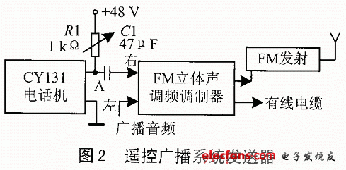 其发送器可以自行设计,也可以采用一台质量较好,带有拨号数字显示和存储电话号码功能的电话机改装。如图2所示,是遥控广播系统发送器。按图连接上+48V电源,选择调整R1的电阻值,使A点电压在电话拿线的情况下为6~12V,再加上一台FM捷变频立体声调频制器和广播音源。