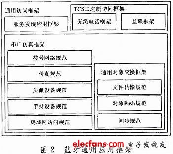 在蓝牙协议体系结构的基础上,蓝牙规范还定义了通用的蓝牙应用框架。应用框架重点选择了标准蓝牙协议中的消息和操作,描述了完整的蓝牙应用操作过程。应用框架的提出大大提高了不同厂家蓝牙产品的互操作性,这给用户带来了便利。在蓝牙通用应用框架中,定义了4个通用框架,它们是实现具体的蓝牙应用的规范和基础。这4个应用框架是:通用访问框架(Generic Access Profile,GAP)、串口仿真框架(Ser ial Port Proflle,SPP)、服务发现应用框架(Service Discovery Application Profile,SDAP)、通用对象交换框架(Generic Object Exc hange Profile,GOEP)。这4个通用框架之间的关系如图2所示。