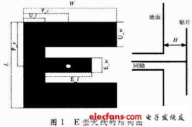 微带天线的结构如图1所示,贴片的长为L,宽为W,馈电点位置为(P_x,P_y),U_l和U_w为U型天线尺寸,U型天线中间增加的微带线的长度和宽度分别为E_l和E_w,微带天线离地面的高度为H。当E_l为零时即为U型天线,E_l不为零时为E型天线。天线采用传统的同轴馈电方式。天线与地面之间采用空气为介质,减少采用高介电常数介质带来的损耗,同时呵达到增加频带宽度的目的。