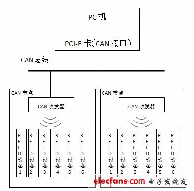如图1 所示,RFID 设备的相关数据将通过无线网络传送至CAN 收发器,后者再将数据通过CAN 总线传送至PC 机,PC 机采用带有CAN 接口的PCI-E 扩展卡。此外,无线通讯芯片nRF24L01 在接受模式下可以接收6 路不同通道的数据,以此来实现一个CAN节点最多控制6 个RFID 终端设备的数据传送。在6个RFID 收费终端不能满足需求的情况下,可以添加更多的节点,所有节点挂载在CAN 总线上,通过CAN总线,每个节点将数据传送至PC 端。