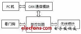 本系统(CAN 节点)有两个子系统组成。B 子系统由单片机、RFID 模块、无线模块、看门狗、液晶屏、时钟模块、按键和EEPROM 组成。微控制器(MCU)控制RFID 模块对Mifare 1 卡进行读写操作,无线模块将有关的数据发送给A 子系统。A 子系统由单片机、无线模块、看门狗和CAN 模块组成。MCU 将经由无线模块接收到的数据通过CAN 模块发送至PC 端。由于一个节点最多可以控制6 个RFID 设备终端,因此在一个完整的系统里,A 子系统只有1 个,而B 子系统最多可以有6 个。