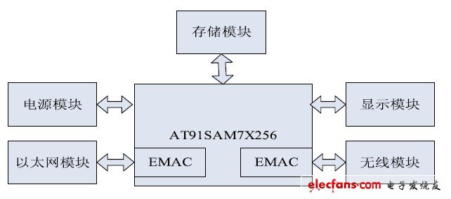其中AT91SAM7X256 作为整个基站的主控芯片,由Atmel 公司出品,它集成了ARM7TDMI 处理器,片内256KB Flash 和64KB SRAM,还包括了USART、SPI、CAN 控制器、Ethernet 网口等外围设备。