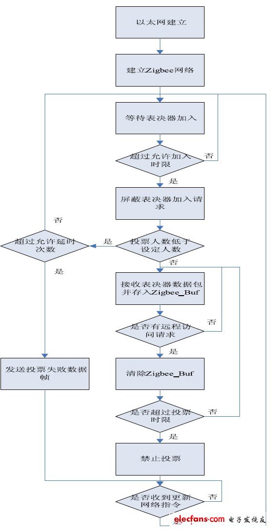 主要实现:1.以太网和Zigbee 网络的建立。2.接受远程监控中心的访问和各项指令。3.维护并管理整个Zigbee 网络。4.接收来自Zigbee 网络中的各投票表决器的投票数据帧。程序流程图如图4 所示。