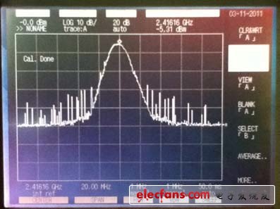 基站完成了联调工作。成功的实现了本文介绍的全部功能。图5 为频谱仪监测基站与无线投票表决器进行通信时的数据传输情况。