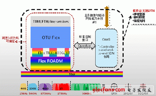 软件定义的OTN包含Flex OTN、Flex Transceiver、Flex ROADM以及Programmable Transport Controller四大关键技术。