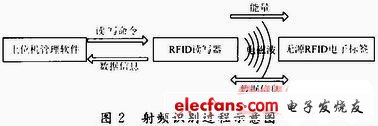 RFID电子标签进入RFID读写器发射的磁场后,接收解读器发出的射频信号,凭借感应电流所获得的能量发送出存储在芯片中的产品信息(Passive Tag,无源标签或被动标签),或者由标签主动发送某一频率的信号(Active Tag,有源标签或主动标签),解渎器渎取信息并解码后,送至中央信息系统进行有关数据处理。射频识别过程示意图如图2所示。