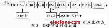 DSP有两种工作模式:解调和中频全景模式。为了提高数字扫描的速度,采用8 MHz中频带宽滤波器,以减少本振调整次数;解调和中频全景频潜显示同时进行,选用带宽为1 MHz滤波器,接收频道处于频谱显示中心。A/D变换采用50 MHz时钟,然后采用14 MHzNCO将采样信号下变频至零中频,进行抽取滤波解调。在数字扫描时,解调停止,中频带宽取8 MHz,NCO固定在14 MHz,抽取滤波之后作FFT,并根据频率分辨率逐点存储并显示。DSP单元设计如图3所示。