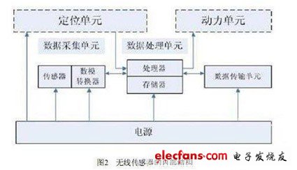 无线传感器一般由数据采集单元、处理输电源等部无线传感器一般由数据采集单元、处理输电源等部分组成(见图2)。被监测物理信号的形式决定了传感器类型,如温度度传感器,监测声音强的压等。处理通常选用嵌入式数度传感器,监测声音强的压等。处理通常选用嵌入式数据传输单元主要由低功耗、短距离的无线通信模块组成。微型化操作系统选用据传输单元主要由低功耗、短距离的无线通信模块组成。微型化操作系统选用嵌入式操作系统,如Vxworks、μCOS-II、μClinux、TinyOS等。