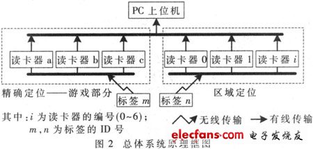 标签的ID号是唯一的,用于游客身份的识别。读写器接收到的数据包含有标签ID号信息、数据发送时刻信息等,PC上位机接收到的数据包含有源标签ID号信息、数据发送时刻信息和转发数据包的读写器编号信息等,PC上位机集中处理这些由读卡器转发而来的数据包。系统原理框图如图2所示。
