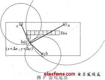 由于电磁波信号在室内传播呈现多径效应干扰衰弱与遮蔽效应,预估的传播距离将产生误差,所以定位的位置不会交于一点,而是一定面积大小的区域。