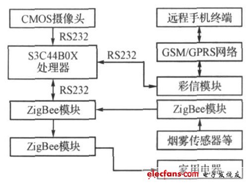 本系统采用模块化设计方案。以嵌入式系统主板为核心,通过CMOS摄像头对关键部位进行安全监测,通过手机传递安全信息和图像彩信,并对家用电器进行远程控制,利用ZigBee模块实现家用电器、系统主板和烟雾、温度、煤气等传感器的无线联网。