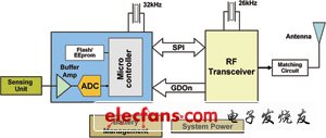 每个无线传感器都被看作一个节点,拥有无线通信能力,同时还具有一定的信号处理与网络数据的智能。根据应用的类型,每个节点都可以有一个指定的地址。图2显示了某个节点的通用结构图。它一般会包括一个传感装置、一个数据处理微控制器,以及一个无线连接RF模块。根据不同的网络定义,RF模块可以起到一个简单发射器或者收发器 (TX/RX)的作用。进行节点设计时,注意电流消耗和处理能力非常的重要。微控制器的内存非常依赖于所使用的软件栈。