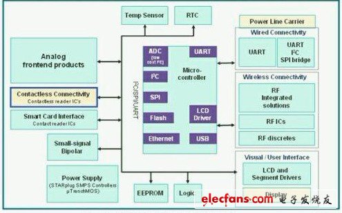从上面的框架图来看,智能卡明显是一个很复杂的系统,包含很多不同的元件。其中包括微控制器、显示驱动器、实时时钟、逻辑产品(一般产品,串行EEPROM,桥接芯片,UART,具有I2C的温度传感器),电源管理产品(starplug家庭),普遍适用的分立(BISS晶体管,肖特基二极管,可再生能源技术)和无线通信模块等。