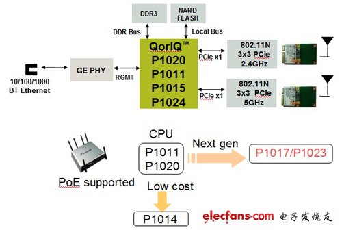 QorIQ P1系列包括单核和双核产品,与QorIQ P2平台产品接脚相容,提供五种系列经济高效的解决方案。单核处理器运行频率为533 MHz (P1011),双核处理器每个内核为1.2 GHz (P2020)。