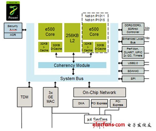 双核(P1020)或单核(P1011)高性能Power Architecture e500核心,32 KB L1缓存高达800 MHz