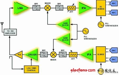 作为接收链路的第1个放大器,低噪声放大器(LNA)是定义整个系统性能的重要组成部分,必须能够在不明显增加噪声的情况下,成功地放大电平非常低的信号。ADI公司的LNA_ADL5521、AD5523工作在400MHz~4GHz,具有最佳增益(ADL5521为15dB,ADL5523为17.5dB)、低噪声系数(ADL5521具有0.8dBNF,ADL5523具有1.1dBNF)、高输出三阶交调载取点、低功耗、内部有源偏置电路,而且所需外部调谐元件最少。