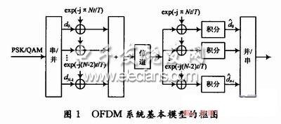 OFDM的基本原理就是把高速的数据流通过串/并变换,分配到传输速率相对较低的若干个相互正交的子信道中进行传输。这样一个OFDM符号内就包含了多个经过调制的子载波信号。每一个信号可以是子载波的相位调制,也可以是子载波幅度和相位的联合调制,比如BPSK,QP-SK,16QAM等。图1给出了OFDM系统基本模型的框图。