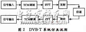 本设计方案根据数字电视地面广播的信道模型进行设计,在设计中选取了2k模式的OFDM参数,DVBT系统程序设计流程图如图2所示。