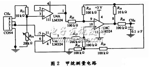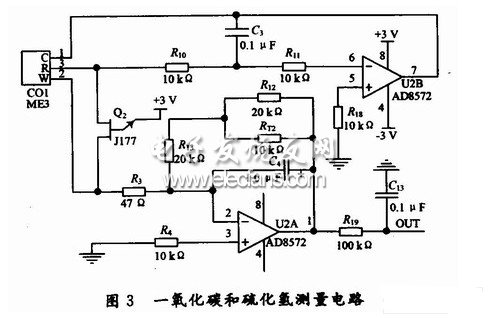 一氧化碳和硫化氢浓度测量均选用了国产的电化学气体传感器,电化学元件根据电化学的原理工作,利用待测气体在电解池中工作电极上的电化学氧化过程,通过电子线路将电解池的工作电极和参比电极恒定在一个适当的电位,在该电位下可以发生待测气体的电化学氧化,由于氧在氧化和还原反应时所产生的法拉第电流很小,可以忽略不计,于是待测气体电化学反应所产生的电流与其浓度成正比并遵循法拉第定律。这样,通过测定电流的大小就可以确定待测气体的浓度。其测量电路如图3所示。