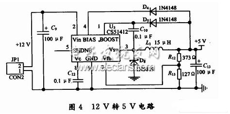 节点供电对于固定节点采用蓄电池供电,对于佩戴型则直接从矿灯去电,由于使用蓄电池供电,因此电源设计时要考虑其转换效率。该系统中电源设计选用了CS51412,CS51411,MAX660三种元件,其中CS51411,CS51412芯片为ON半导.体推出的新型补偿稳压器系列产品,精度高,开关频率性能优异,功能完备,专用于蜂窝基站和无线通信基础设施,其输入电压范围在4.5~40 V之间。MAX660芯片为MAXIM推出的电源转换芯片,可以实现+3 V到-3 V电源的转换。12 V转5 V电路如图4所示。