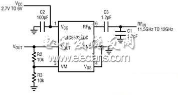 图 1 显示这个 12GHz 检波器的 RF 输入,该输入匹配到 11.5GHz 至 12GHz。因此它的输入电路可以连接到一个定向耦合器的耦合输出或一个 RF 源。利用电阻器R2和R3 (阻值各为 10k) 在外部设定检波器输出放大器增益,从而对内部放大器 (具有一个数值为2的同相增益) 周围的环路进行补偿。在 12GHz 频率时,电路板材料可能引入可影响输入阻抗匹配的电路寄生性。不过,可以用标准 FR-4 PC 电路板材料实现可接受的性能。RF 输入匹配由两个 1.2pF 电容器、C1 和 C3 组成。C3 电容器还起 DC 隔离作用,因为该器件的 RF 输入是内部 DC 偏置的。RF 输入匹配也许需要为每一个具体的应用布局或其它工作频率而重新优化。在12GHz频率下,测得的RF输入回程损耗为10dB。图2中的曲线图描绘的是:当一个12GHz RF输入信号掠过-24dBm至8dBm (有效检波范围) 时检波器的传输特性。