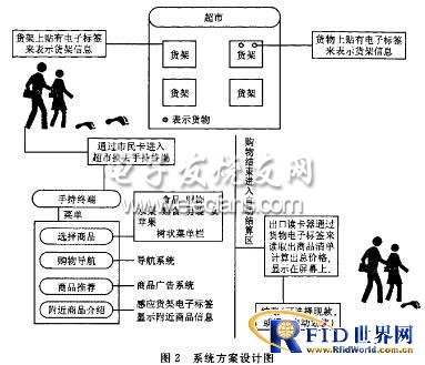 超市物联网导购系统有货架处的有源RFID标签、超市范围内的一定数量的读卡器和每个顾客的手持设备,该设备由顾客输入产品信息并与超市中的读卡器进行通信,引导顾客到达所需商品处。
