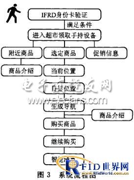 超市范围内安装一定数量的读卡器就是该中间系统的重要组成部分,同时为每一个进入超市选购商品的顾客配置一个手持设备,顾客在手持设备上输人所需的商品名称,手持设备与超市中的读卡器通过中间件操作系统通信,发布自己的信息,读卡器发布路由信息到手持设备引导顾客前往所需购买的商品处。