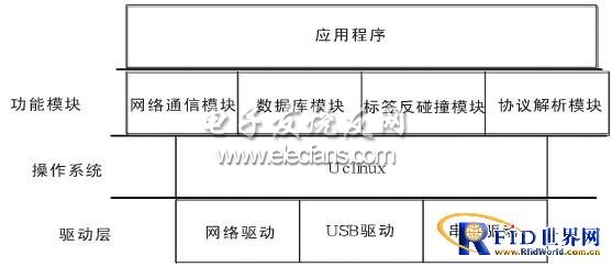 操作系统采用uClinux 系统作为操作系统, 用来管理各类硬件和提供软件运行平台。由驱动层提供各类设备诸如以太网, 串口, USB 存储器, 状态灯等设备的驱动。网络通信模块负责将处理得来的标签信息回传到后台服务器, 同时也可以根据后台服务器的命令来控制主控模块参数从而改变工作模式。嵌入式数据库控制模块负责将系统保存系统的工作日志, 并将读取到的标签和相关数据保存到本地数据库, 以备以后的查询。协议解析模块负责对受到数据通信包进行协议解析, 取出有效的标签数据, 并进行标签反碰撞操作, 处理各类干扰问题, 保证受到标签数据的完整性, 也是整个软件体系的核心部分。